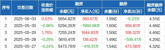 融资方面,当日融资买入1823.72万元,融资偿还1463.16万元,融资净买入360.57万元。融券方面,融券卖出3.96万份,融券偿还10.19万份,融券余量1.59亿份,融券余额3.95亿元。融资融券余额合计4.51亿元。