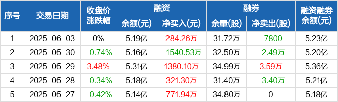 融资方面,当日融资买入3045.68万元,融资偿还2761.42万元,融资净买入284.26万元。融券方面,融券卖出1.35万股,融券偿还2.13万股,融券余量31.72万股,融券余额383.49万元。融资融券余额合计5.23亿元。