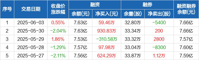融资方面,当日融资买入1634.16万元,融资偿还1574.7万元,融资净买入59.46万元。融券方面,融券卖出2900股,融券偿还8300股,融券余量32.8万股,融券余额301.43万元。融资融券余额合计7.66亿元。