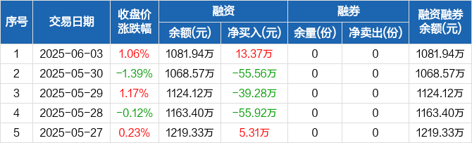 融资方面,当日融资买入98.62万元,融资偿还85.25万元,融资净买入13.37万元。融券方面,融券卖出0份,融券偿还0份,融券余量0份,融券余额0元。融资融券余额合计1081.94万元。