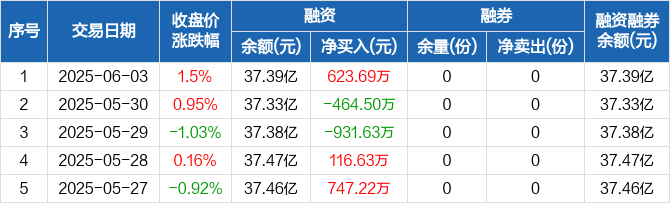 融资方面,当日融资买入5271.79万元,融资偿还4648.1万元,融资净买入623.69万元。融券方面,融券卖出0份,融券偿还0份,融券余量0份,融券余额0元。融资融券余额合计37.39亿元。