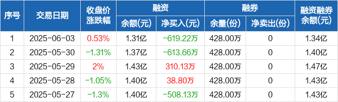融资方面,当日融资买入937.86万元,融资偿还1557.08万元,融资净偿还619.22万元。融券方面,融券卖出0份,融券偿还0份,融券余量428万份,融券余额325.28万元。融资融券余额合计1.34亿元。