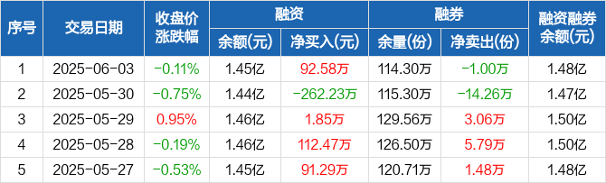 融资方面,当日融资买入220.58万元,融资偿还128.01万元,融资净买入92.58万元。融券方面,融券卖出3.81万份,融券偿还4.81万份,融券余量114.3万份,融券余额302.21万元。融资融券余额合计1.48亿元。