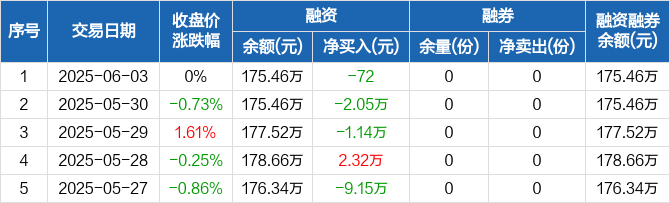 融资方面,当日融资买入19.51万元,融资偿还19.51万元,融资净偿还72元,连续3日净偿还累计3.2万元。融券方面,融券卖出0份,融券偿还0份,融券余量0份,融券余额0元。融资融券余额合计175.46万元。
