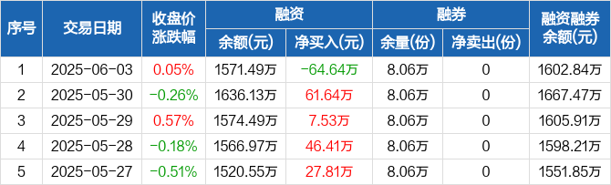 融资方面,当日融资买入41.33万元,融资偿还105.98万元,融资净偿还64.64万元。融券方面,融券卖出0份,融券偿还0份,融券余量8.06万份,融券余额31.35万元。融资融券余额合计1602.84万元。