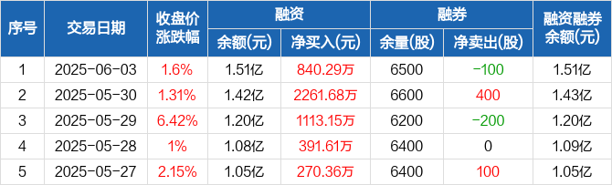 融资方面,当日融资买入2006.05万元,融资偿还1165.76万元,融资净买入840.29万元,连续5日净买入累计4877.09万元。融券方面,融券卖出0股,融券偿还100股,融券余量6500股,融券余额46.35万元。融资融券余额合计1.51亿元。