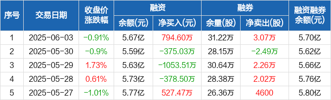 融资方面,当日融资买入3155.51万元,融资偿还2360.91万元,融资净买入794.6万元。融券方面,融券卖出3.07万股,融券偿还0股,融券余量31.22万股,融券余额307.2万元。融资融券余额合计5.7亿元。