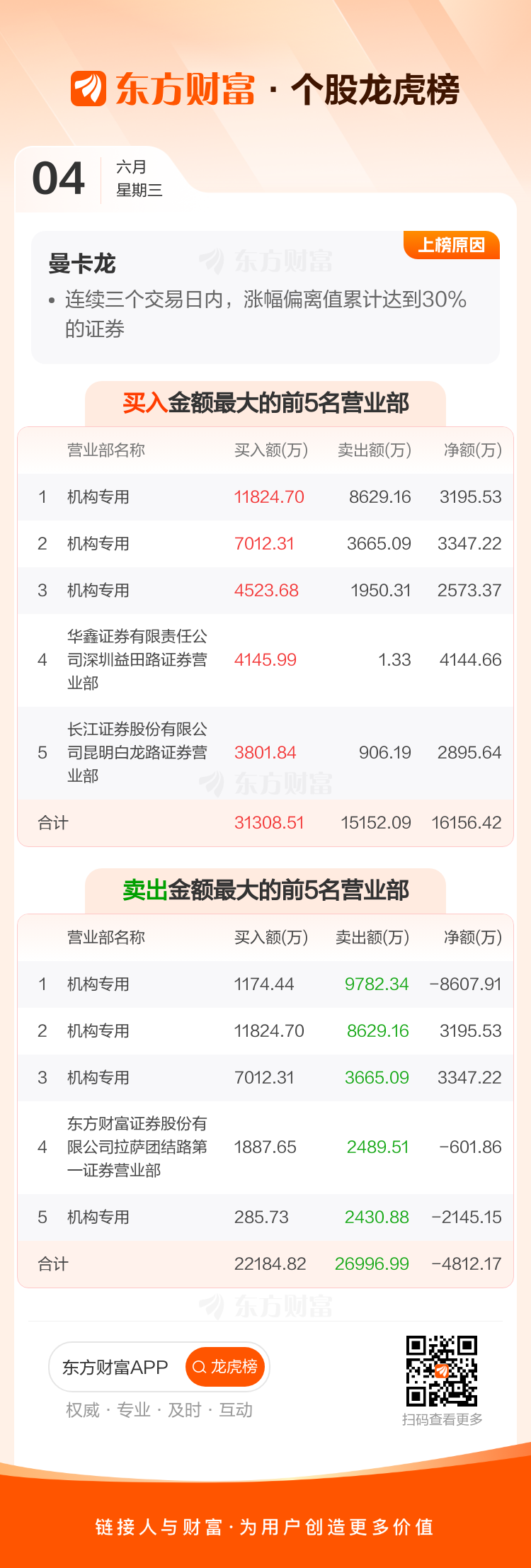 交易所2025年6月4日公布的交易公开信息显示,曼卡龙因成为连续三个交易日内,涨幅偏离值累计达到30%的证券上榜。曼卡龙当日收报29.37元,涨跌幅17.01%,换手率26.46%,成交额17.86亿。异常期间6月3日至6月4日,期间涨幅40.39%,累计偏离值38.53%,区间成交额28.64亿。