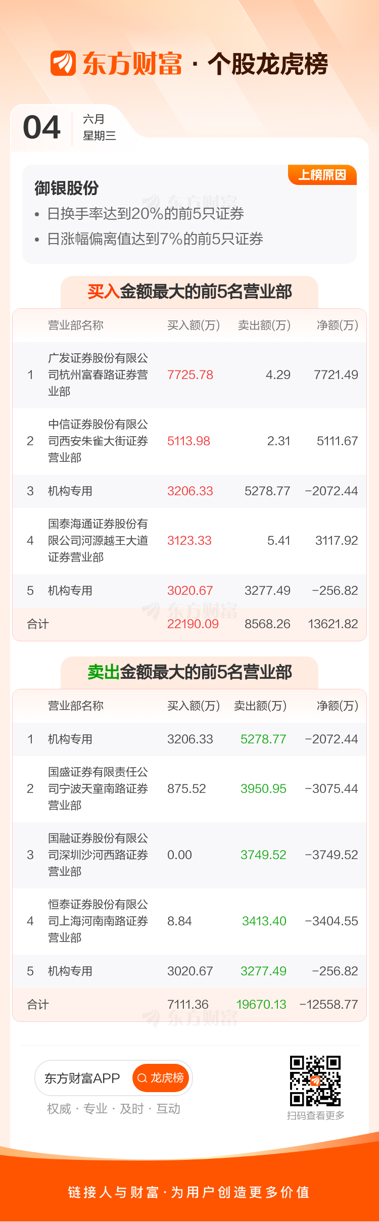 交易所2025年6月4日公布的交易公开信息显示,御银股份因成为日换手率达到20%的前5只证券、日涨幅偏离值达到7%的前5只证券上榜。御银股份当日收报7.67元,涨跌幅10.04%,偏离值61.80%,换手率68.71%,成交额34.71亿。