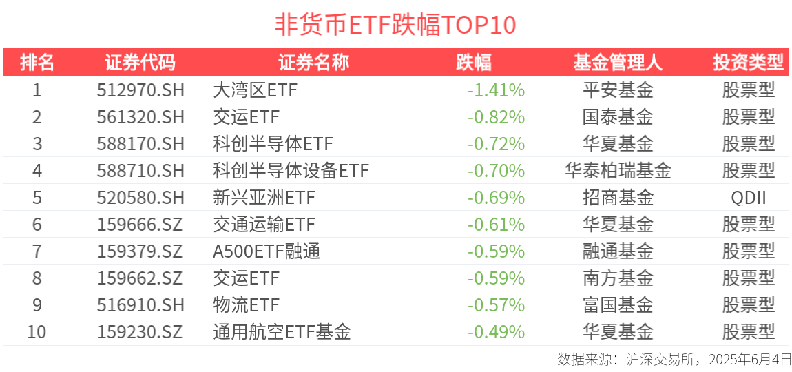 截至今日收盘,全市场共计71只非货ETF下跌,下跌比例达6%。行业主题指数方面,中证内地运输主题指数、国证交通运输行业指数跌幅居前,分别下跌0.98%、0.80%。
