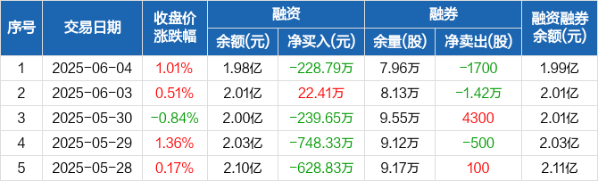融资方面,当日融资买入195.24万元,融资偿还424.03万元,融资净偿还228.79万元。融券方面,融券卖出0股,融券偿还1700股,融券余量7.96万股,融券余额47.76万元。融资融券余额合计1.99亿元。
