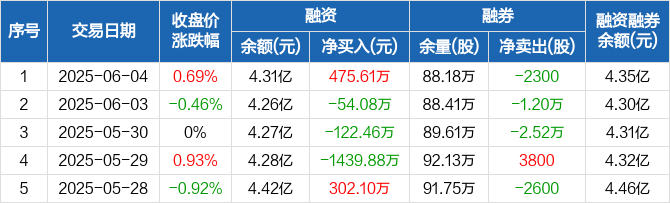 融资方面,当日融资买入1352.54万元,融资偿还876.93万元,融资净买入475.61万元。融券方面,融券卖出4700股,融券偿还7000股,融券余量88.18万股,融券余额385.35万元。融资融券余额合计4.35亿元。