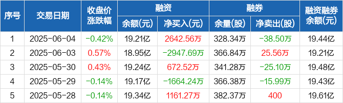 融资方面,当日融资买入2.27亿元,融资偿还2.01亿元,融资净买入2642.56万元。融券方面,融券卖出3.34万股,融券偿还41.84万股,融券余量328.34万股,融券余额2324.67万元。融资融券余额合计19.44亿元。