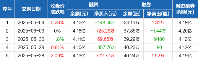 融资方面,当日融资买入1344.11万元,融资偿还1492.79万元,融资净偿还148.68万元。融券方面,融券卖出1.92万股,融券偿还6100股,融券余量39.16万股,融券余额171.13万元。融资融券余额合计4.18亿元。