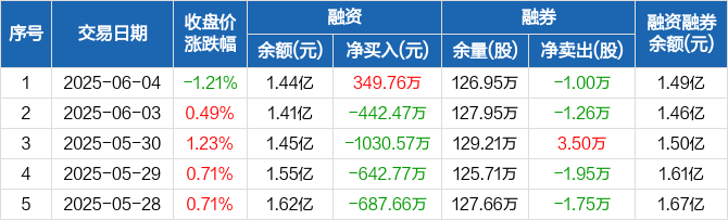 融资方面,当日融资买入1151.98万元,融资偿还802.22万元,融资净买入349.76万元。融券方面,融券卖出9200股,融券偿还1.92万股,融券余量126.95万股,融券余额517.96万元。融资融券余额合计1.49亿元。