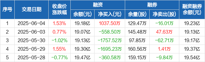 融资方面,当日融资买入9615.48万元,融资偿还8577.98万元,融资净买入1037.5万元。融券方面,融券卖出22.5万股,融券偿还38.51万股,融券余量129.47万股,融券余额516.59万元。融资融券余额合计19.23亿元。