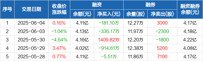 浙江鼎力融资融券信息显示,2025年6月4日融资净偿还181.1万元;融资余额4.11亿元,较前一日下降0.44%。