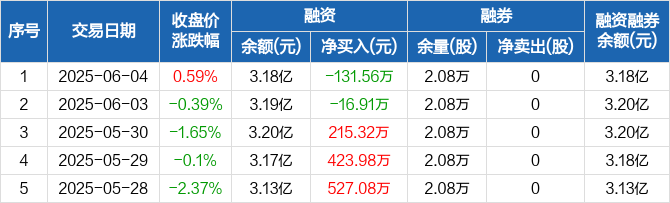 融资方面,当日融资买入265.79万元,融资偿还397.35万元,融资净偿还131.56万元。融券方面,融券卖出0股,融券偿还0股,融券余量2.08万股,融券余额21.11万元。融资融券余额合计3.18亿元。