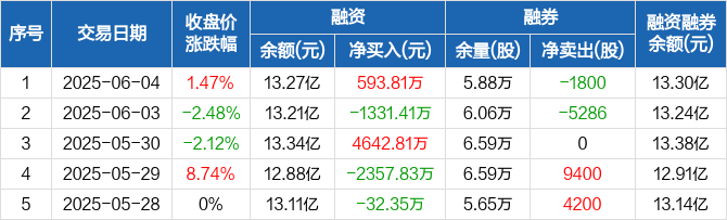 融资方面,当日融资买入5079.97万元,融资偿还4486.16万元,融资净买入593.81万元。融券方面,融券卖出0股,融券偿还1800股,融券余量5.88万股,融券余额300.52万元。融资融券余额合计13.3亿元。