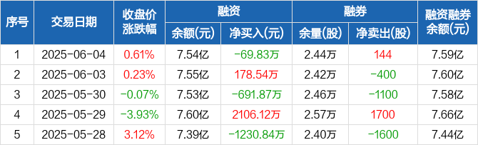 融资方面,当日融资买入1108.52万元,融资偿还1178.34万元,融资净偿还69.83万元。融券方面,融券卖出344股,融券偿还200股,融券余量2.44万股,融券余额559.46万元。融资融券余额合计7.59亿元。
