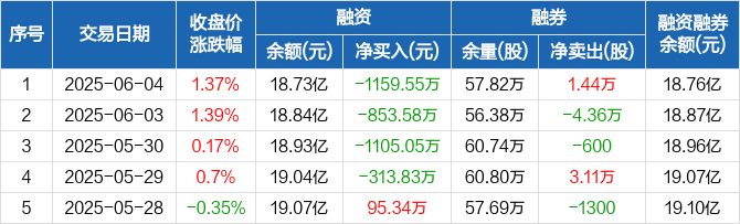 融资方面,当日融资买入4194.77万元,融资偿还5354.33万元,融资净偿还1159.55万元,连续4日净偿还累计3432.02万元。融券方面,融券卖出2.49万股,融券偿还1.05万股,融券余量57.82万股,融券余额341.69万元。融资融券余额合计18.76亿元。