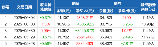 融资方面,当日融资买入7387.6万元,融资偿还6029.4万元,融资净买入1358.21万元。融券方面,融券卖出1.97万股,融券偿还1.5万股,融券余量34.18万股,融券余额184.23万元。融资融券余额合计11.12亿元。
