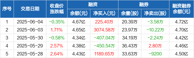 融资方面,当日融资买入1777.47万元,融资偿还1552.07万元,融资净买入225.4万元。融券方面,融券卖出3.37万股,融券偿还6.95万股,融券余量20.39万股,融券余额458.37万元。融资融券余额合计4.72亿元。