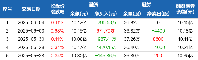 融资方面,当日融资买入961.64万元,融资偿还1258.17万元,融资净偿还296.53万元。融券方面,融券卖出0股,融券偿还0股,融券余量36.82万股,融券余额326.23万元。融资融券余额合计10.15亿元。