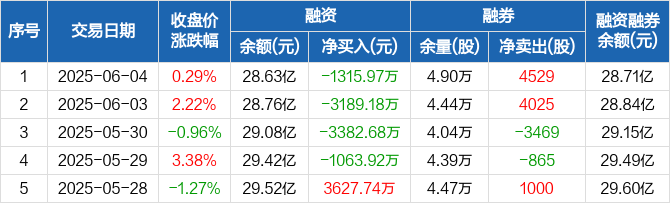中微公司融资融券信息显示,2025年6月4日融资净偿还1315.97万元;融资余额28.63亿元,较前一日下降0.46%。
