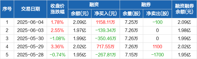 融资方面,当日融资买入2381.83万元,融资偿还1223.72万元,融资净买入1158.11万元。融券方面,融券卖出0股,融券偿还100股,融券余量7.25万股,融券余额41.47万元。融资融券余额合计2.09亿元。
