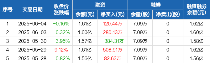融资方面,当日融资买入825.35万元,融资偿还704.92万元,融资净买入120.44万元。融券方面,融券卖出0股,融券偿还0股,融券余量7.09万股,融券余额44.6万元。融资融券余额合计1.62亿元。