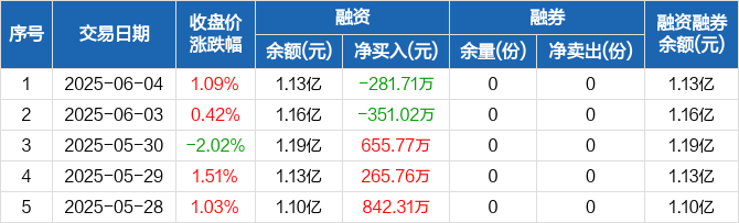融资方面,当日融资买入5703.61万元,融资偿还5985.32万元,融资净偿还281.71万元。融券方面,融券卖出0份,融券偿还0份,融券余量0份,融券余额0元。融资融券余额合计1.13亿元。