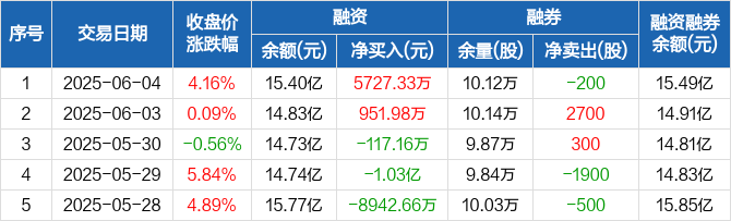 融资方面,当日融资买入3.15亿元,融资偿还2.58亿元,融资净买入5727.33万元。融券方面,融券卖出1800股,融券偿还2000股,融券余量10.12万股,融券余额862.09万元。融资融券余额合计15.49亿元。
