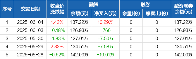 融资方面,当日融资买入11.57万元,融资偿还1.28万元,融资净买入10.29万元。融券方面,融券卖出0份,融券偿还0份,融券余量0份,融券余额0元。融资融券余额合计137.22万元。