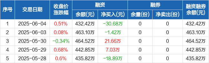 融资方面,当日融资买入11.65万元,融资偿还42.33万元,融资净偿还30.68万元。融券方面,融券卖出0份,融券偿还0份,融券余量0份,融券余额0元。融资融券余额合计432.42万元。