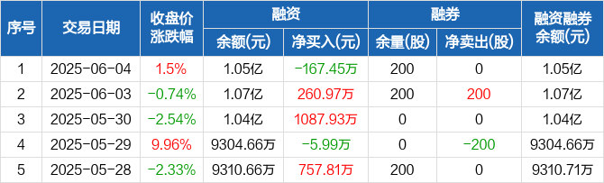 融资方面,当日融资买入1073.63万元,融资偿还1241.09万元,融资净偿还167.45万元。融券方面,融券卖出0股,融券偿还0股,融券余量200股,融券余额542元。融资融券余额合计1.05亿元。