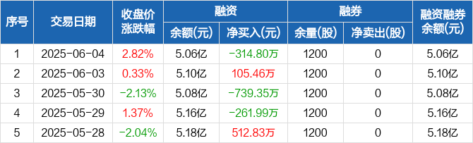 融资方面,当日融资买入1631.57万元,融资偿还1946.36万元,融资净偿还314.8万元。融券方面,融券卖出0股,融券偿还0股,融券余量1200股,融券余额3.42万元。融资融券余额合计5.06亿元。