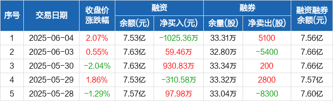 融资方面,当日融资买入2565.31万元,融资偿还3590.67万元,融资净偿还1025.36万元。融券方面,融券卖出6400股,融券偿还1300股,融券余量33.31万股,融券余额312.45万元。融资融券余额合计7.56亿元。