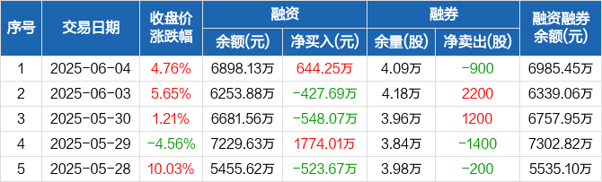融资方面,当日融资买入2769.24万元,融资偿还2124.99万元,融资净买入644.25万元。融券方面,融券卖出1700股,融券偿还2600股,融券余量4.09万股,融券余额87.32万元。融资融券余额合计6985.45万元。