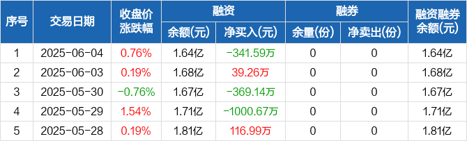 融资方面,当日融资买入320.43万元,融资偿还662.02万元,融资净偿还341.59万元。融券方面,融券卖出0份,融券偿还0份,融券余量0份,融券余额0元。融资融券余额合计1.64亿元。