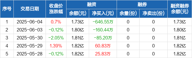 融资方面,当日融资买入1229.25万元,融资偿还1875.8万元,融资净偿还646.55万元,连续3日净偿还累计892.19万元。融券方面,融券卖出0份,融券偿还0份,融券余量0份,融券余额0元。融资融券余额合计1.73亿元。