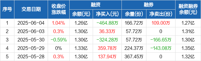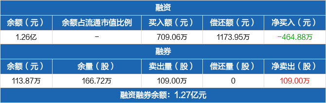 融资方面,当日融资买入709.06万元,融资偿还1173.95万元,融资净偿还464.88万元。融券方面,融券卖出109万份,融券偿还0份,融券余量166.72万份,融券余额113.87万元。融资融券余额合计1.27亿元。