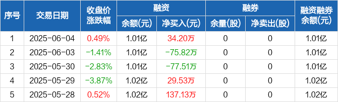 融资方面,当日融资买入259.38万元,融资偿还225.18万元,融资净买入34.2万元。融券方面,融券卖出0股,融券偿还0股,融券余量0股,融券余额0元。融资融券余额合计1.01亿元。