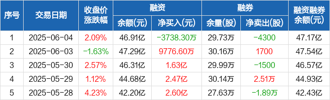 胜宏科技融资融券信息显示,2025年6月4日融资净偿还3738.3万元;融资余额46.91亿元,较前一日下降0.79%。