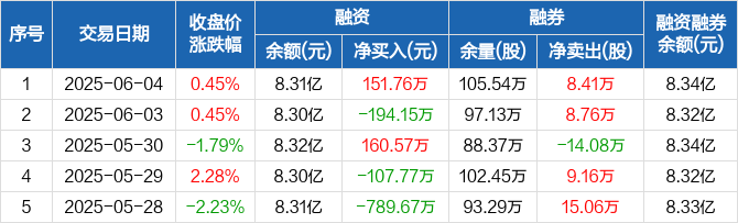 融资方面,当日融资买入741万元,融资偿还589.24万元,融资净买入151.76万元。融券方面,融券卖出8.45万股,融券偿还400股,融券余量105.54万股,融券余额234.3万元。融资融券余额合计8.34亿元。