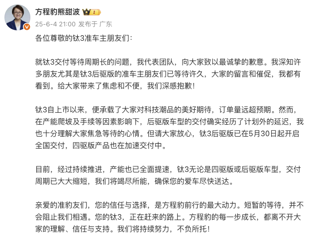 6月4日晚间,比亚迪集团方程豹事业部总经理熊甜波在微博发文,就钛3交付等待周期长问题致歉。