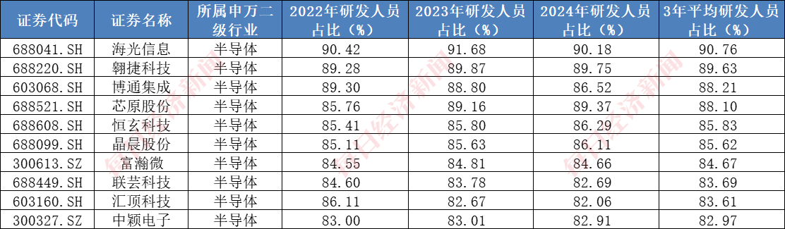 从最近三年平均研发人员数量占比来看,排在电子行业第一位的是海光信息,研发人员数量占比超过90%。而最近三年整个A股电子板块平均研发人员数量占比约为25%。最近三年平均研发人员数量占比排在前十名的公司全部集中在半导体这个申万二级行业中。