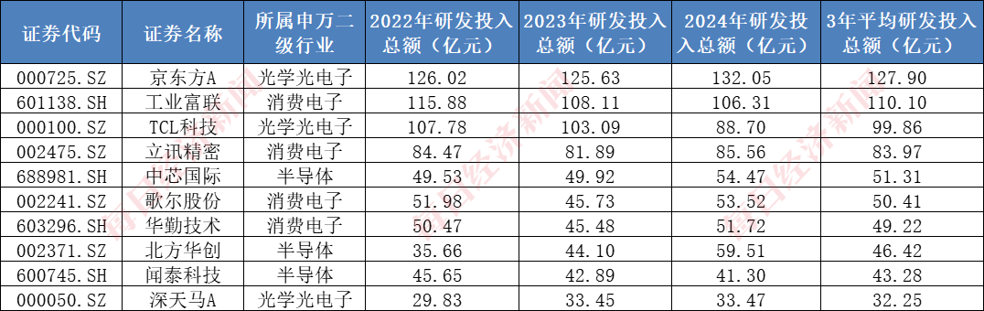不过,电子行业上市公司研发投入总额与其营业收入表现之间具有明显的关系。同花顺iFinD数据显示,2022年至2024年,电子板块的营业收入分别为3.01万亿元、2.96万亿元和3.48万亿元。而最近三年研发投入总额排在前十名的上市公司贡献了整个电子板块超过47%的营业收入,2022~2024年,最近三年研发投入总额排在前十名的上市公司营业收入合计分别为1.42万亿元、1.40万亿元和1.65万亿元。