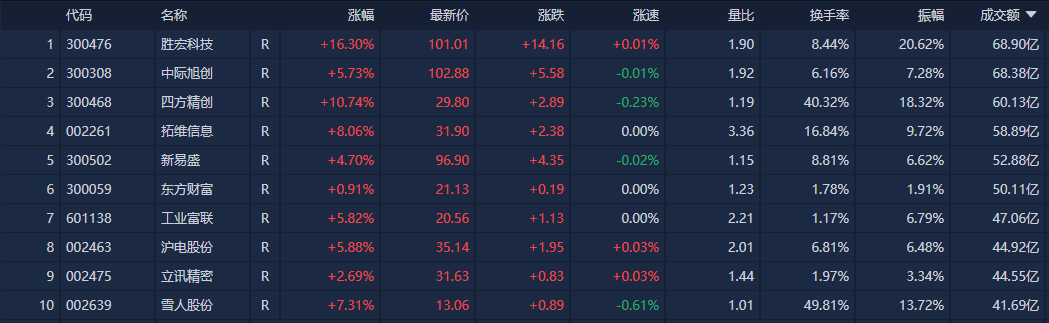 胜宏科技成交额居首,为68.90亿元。其后是中际旭创、四方精创、拓维信息、新易盛,成交额分别为68.38亿元、60.13亿元、58.89亿元、52.88亿元。