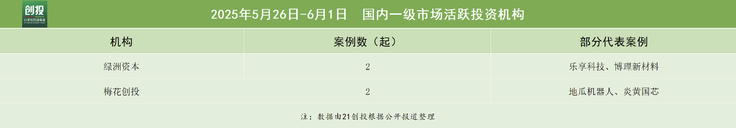 过去一周披露的投融资案例显示,科技与制造赛道依然是市场关注的重点。5月28日,深圳地瓜机器人有限公司完成1亿美元A轮融资,本轮融资获得海内外众多投资机构青睐,为地瓜机器人加速构建具身智能生态版图注入强劲动力。本周完成新融资的科技与制造企业持续向前沿技术集聚,涵盖机器人、半导体、新材料等多个关键领域。